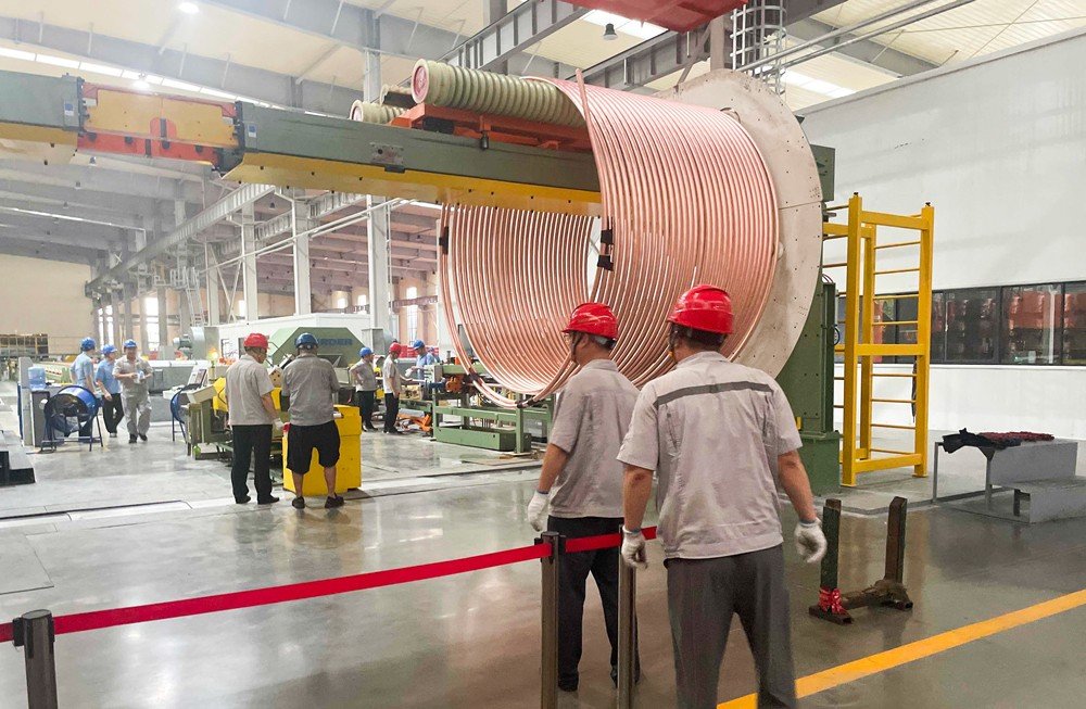 20:55,直管生產(chǎn)班組長(zhǎng)于有龍根據(jù)客戶(hù)要求開(kāi)始進(jìn)行Φ54×2直管的工藝試驗(yàn),精度方面必須先確保壁厚2mm不能出現(xiàn)負(fù)公差,再研究控制正公差;幾次試制下來(lái),于班長(zhǎng)最終定好拉制工藝,與直拉機(jī)師傅囑咐妥當(dāng)后,才和李祥鵬部長(zhǎng)完成交接下班回家。李祥鵬部長(zhǎng)、孫濤部長(zhǎng)、楊書(shū)虎科長(zhǎng)、高元陽(yáng)科長(zhǎng)、質(zhì)檢巡檢員羅學(xué)迅輪流駐在直管生產(chǎn)線(xiàn)進(jìn)行檢驗(yàn),把控精度公差,每10分鐘做一次檢測(cè),確保生產(chǎn)出的銅管在客戶(hù)要求的范圍之內(nèi)。大直管粗重,拉制起來(lái)勞動(dòng)強(qiáng)度大要求條件高,四位直拉機(jī)員工師傅在高溫下很快汗流浹背,身上的工作服被汗水浸透,被散熱扇吹干了又濕、濕了又干,反反復(fù)復(fù)。李部長(zhǎng)看在眼里、疼在心里,忍不住下手與員工師傅并肩一起干。