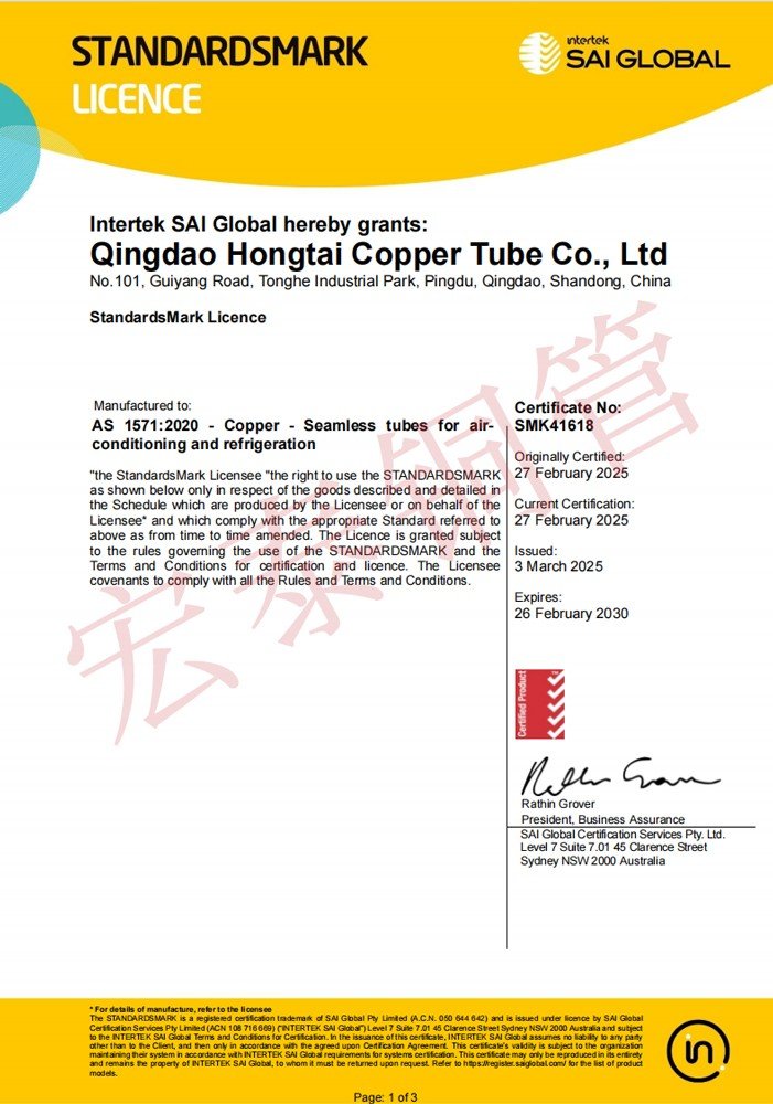 這兩項權(quán)威認(rèn)證作為進(jìn)入大洋洲及周邊市場的銅管產(chǎn)品通行證,標(biāo)志著宏泰銅管產(chǎn)品質(zhì)量穩(wěn)定性再次得到國際印證。