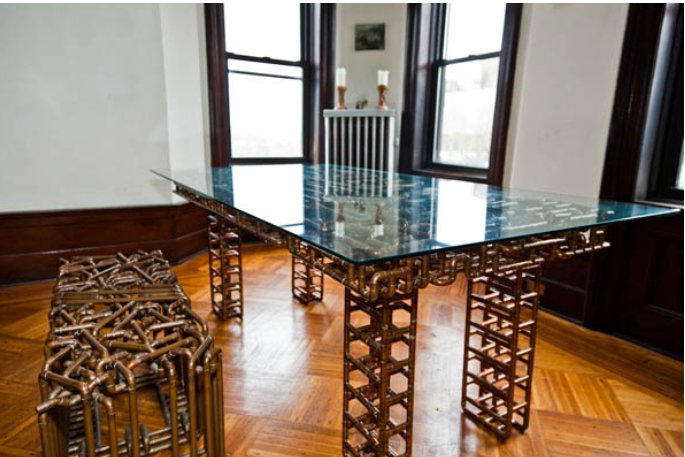 以上圖片所用到的銅管為硬態(tài),用擠壓法所成型,接口處用銅管件連接,主要使用三通管件和90度彎銅接頭,使用焊接的方式連接到一起,外表自然氧化,用切割工具將銅管切割成數(shù)段,按照自己的設(shè)計拼接到一起,巧妙的運用間架結(jié)構(gòu),堅固、美觀、實用,筆者認為,這種銅管制成的桌子宜放在寬敞一些的客廳,窄小的客廳難以彰顯其大氣,并且最好能讓陽光射到,在光線的反射中細細欣賞,燃一支煙,尋找曾經(jīng)經(jīng)歷的崢嶸歲月,任煙霧裊裊,在銅管的光亮下沉入浮想,如此境界,堪稱之絕。