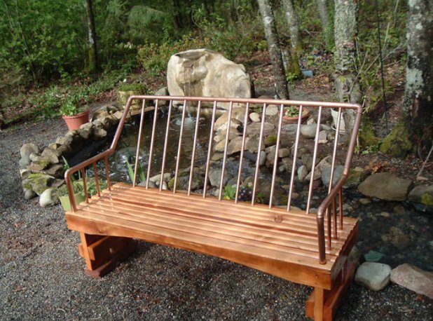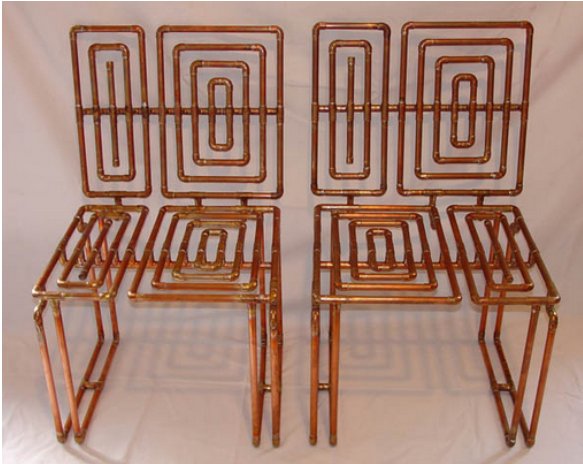 銅管桌子說完了,再說說椅子,看到上圖,各位讀者未免懷疑這板凳的穩(wěn)定性,如果你親自用手彎一下外徑35mm,壁厚且2mm的銅管,相信你再也不會擔心這板凳的承重能力,銅管可按照自己的想法切割,但是事先得設(shè)計好圖紙,用銅管設(shè)計最重要的是要考慮連接處的穩(wěn)定性,以銀焊條焊接可以很好的保證連接處的穩(wěn)定性,以上的板凳如果讀者對靠背的牢固程度擔憂,可在椅面與椅背之間加一根支撐,利用三角形的穩(wěn)定性,也可在椅面與椅背之見做一個矩形的扶手,實用也不影響美觀。
