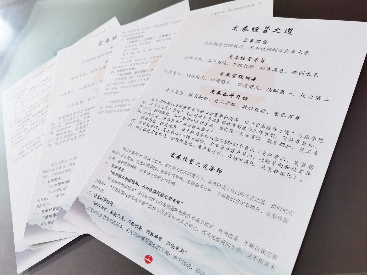 奮進(jìn)的道路上,李福鵬一直秉承“宏泰經(jīng)營(yíng)之道”的指導(dǎo)思想。堅(jiān)持“時(shí)刻擁有創(chuàng)新精神,不為短期利益出賣未來(lái)”的宏泰理念,本著利己不損人,堅(jiān)持利他才能利己,合作才能雙贏的管理思維,積極落實(shí)5S + 四個(gè)意識(shí) + 快樂創(chuàng)新;牢牢堅(jiān)持客戶導(dǎo)向、問(wèn)題導(dǎo)向和結(jié)果導(dǎo)向;重點(diǎn)聚焦法制第一和精細(xì)化思維工作方式,圍繞宏泰經(jīng)營(yíng)宗旨和管理綱要的中心思想,逐漸使宏泰人形成人心思進(jìn)、團(tuán)結(jié)和諧、共促發(fā)展的良好氛圍,在穩(wěn)步推進(jìn)宏泰四化的基礎(chǔ)上,堅(jiān)持穩(wěn)走四條道路:堅(jiān)持宏泰經(jīng)營(yíng)之道厚德載物,走員工幸福的道路;堅(jiān)持把合規(guī)放首位,走穩(wěn)健經(jīng)營(yíng)的道路;堅(jiān)持管理信息化和生產(chǎn)數(shù)字化直至智能化的兩化深度融合,走分工專業(yè)化道路;堅(jiān)持KPI考核,走績(jī)效管理的道路。